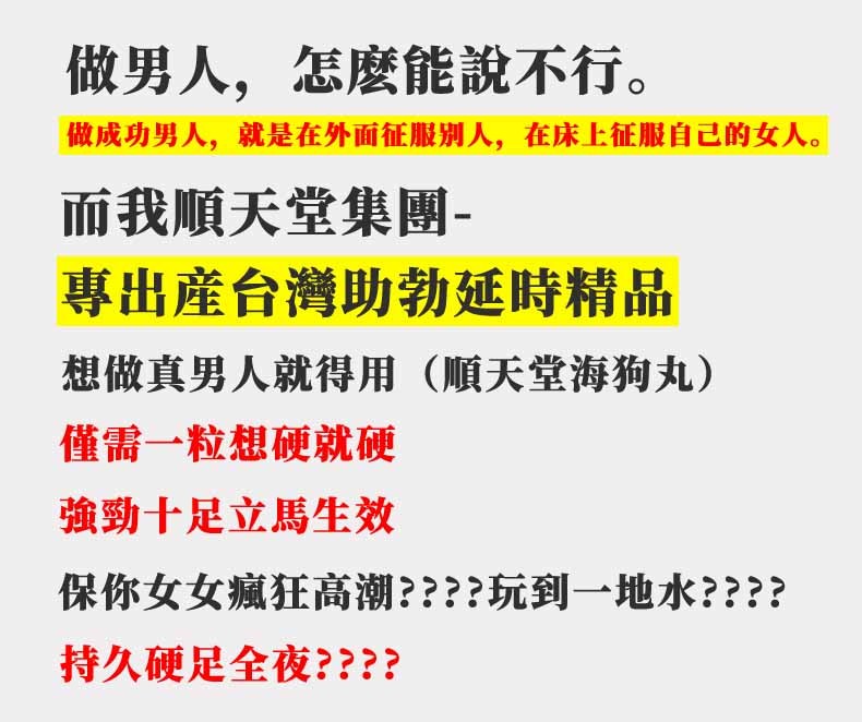 10-21台灣順天堂海狗丸官方正品,【大】男人的秘密武器,純中藥調理不傷身,可滋養睪丸二次發育,增大增粗 !完美解決所有性功能障礙,事前一粒輕鬆“硬”對自如,藥勁猛烈幹她一夜搞到她求饒! - ①療程2瓶 僅需NT$:960 【勃起延時】