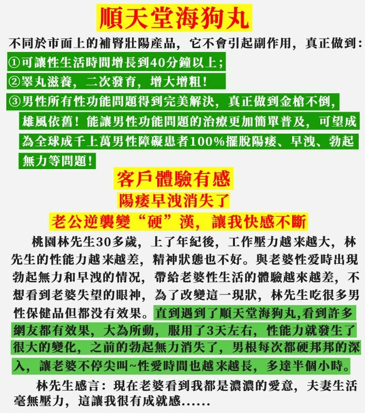 10-25台灣順天堂海狗丸官方正品,【大】男人的秘密武器,純中藥調理不傷身,可滋養睪丸二次發育,增大增粗 !完美解決所有性功能障礙,事前一粒輕鬆“硬”對自如,藥勁猛烈幹她一夜搞到她求饒! - ①療程2瓶 僅需NT$:960 【勃起延時】