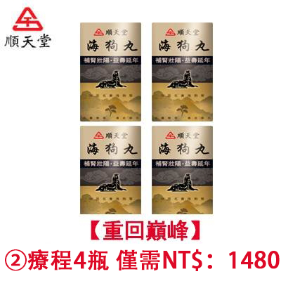 10-22台灣順天堂海狗丸官方正品,【大】男人的秘密武器,純中藥調理不傷身,可滋養睪丸二次發育,增大增粗 !完美解決所有性功能障礙,事前一粒輕鬆“硬”對自如,藥勁猛烈幹她一夜搞到她求饒! - ②療程4瓶 僅需NT$:1480【重回巔峰】僅剩12組